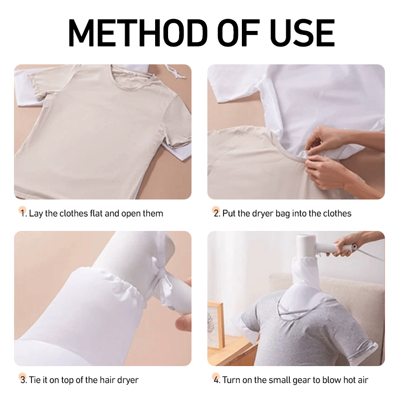 - Conecta el secador: Coloca la boquilla del secador de pelo en la salida de aire de la bolsa y ajusta las correas de sujeción para fijarlo.