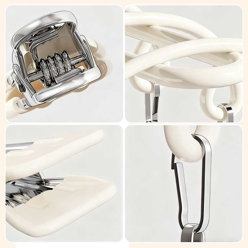 PINZAS SUAVES PARA ROUPA: Equipado con pinzas fuertes con puntas de PVC, diseñadas para sujetar prendas de forma segura sin dejar marcas indeseadas ni hundimientos en tejidos delicados o materiales sensibles.